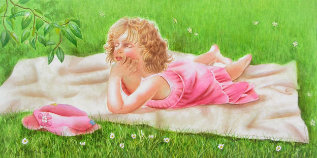 Still I loved the idea of this painting I decided some weeks ago that I’d do this painting again. I wanted to describe how little girls enjoy themselves, how they can get lost in their own world, here and there playing and then they are tired and they simply sleep whenever they like and just at the place where they are. We adults rarely take this time for ourselves, always busy instead of simply enjoying an hour in the sun. Of course in my painting it is a wonderful place for a little girl in her beautiful pink dress to sleep, laying in the sun, the leaves are swaying in the breeze and the cozy blanket is just so inviting, the hat is just put aside and lays in the grass – the perfect moment for a dreamy afternoon.